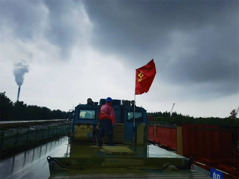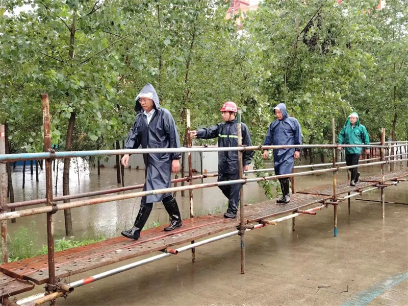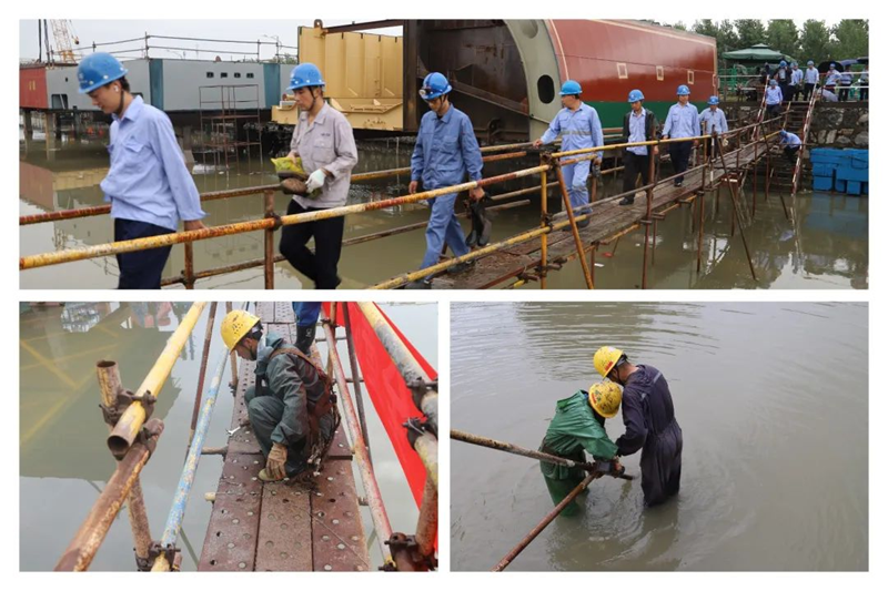 汛情就是命令,6月28日,公司迅速進(jìn)入防汛警戒狀態(tài),黨委組織召開防汛工作專題二次會(huì)議,宣布啟動(dòng)三級防汛應(yīng)急響應(yīng),防汛領(lǐng)導(dǎo)小組圍繞“確保財(cái)產(chǎn)生命安全和快速復(fù)產(chǎn)”,周密部署各部門防汛工作,建立6支黨員防洪突擊隊(duì)、7支青年突擊隊(duì)隨時(shí)待命,要求黨員干部靠前指揮,24小時(shí)輪崗值班,號召全體員工團(tuán)結(jié)一致,共克時(shí)艱。隨著防汛領(lǐng)導(dǎo)小組一聲令下,各部門黨員、團(tuán)員青年、群眾立即奔赴一線,沖鋒在前,在碼頭、閘門開展不間斷、拉網(wǎng)式巡邏檢查,險(xiǎn)情排查,切實(shí)做好防汛抗洪工作。船臺(tái)區(qū)域漫水,阻斷了前往船臺(tái)上、碼頭的道路,創(chuàng)新的蕪船人連夜搶險(xiǎn),在風(fēng)雨中用雙手和鐵架一寸寸搭建,搭出一條1200米長的空中“長廊”,連通碼頭、引橋和船臺(tái);為保障汛期人員安全,“長廊”入口處設(shè)立哨口登記記錄出入情況。